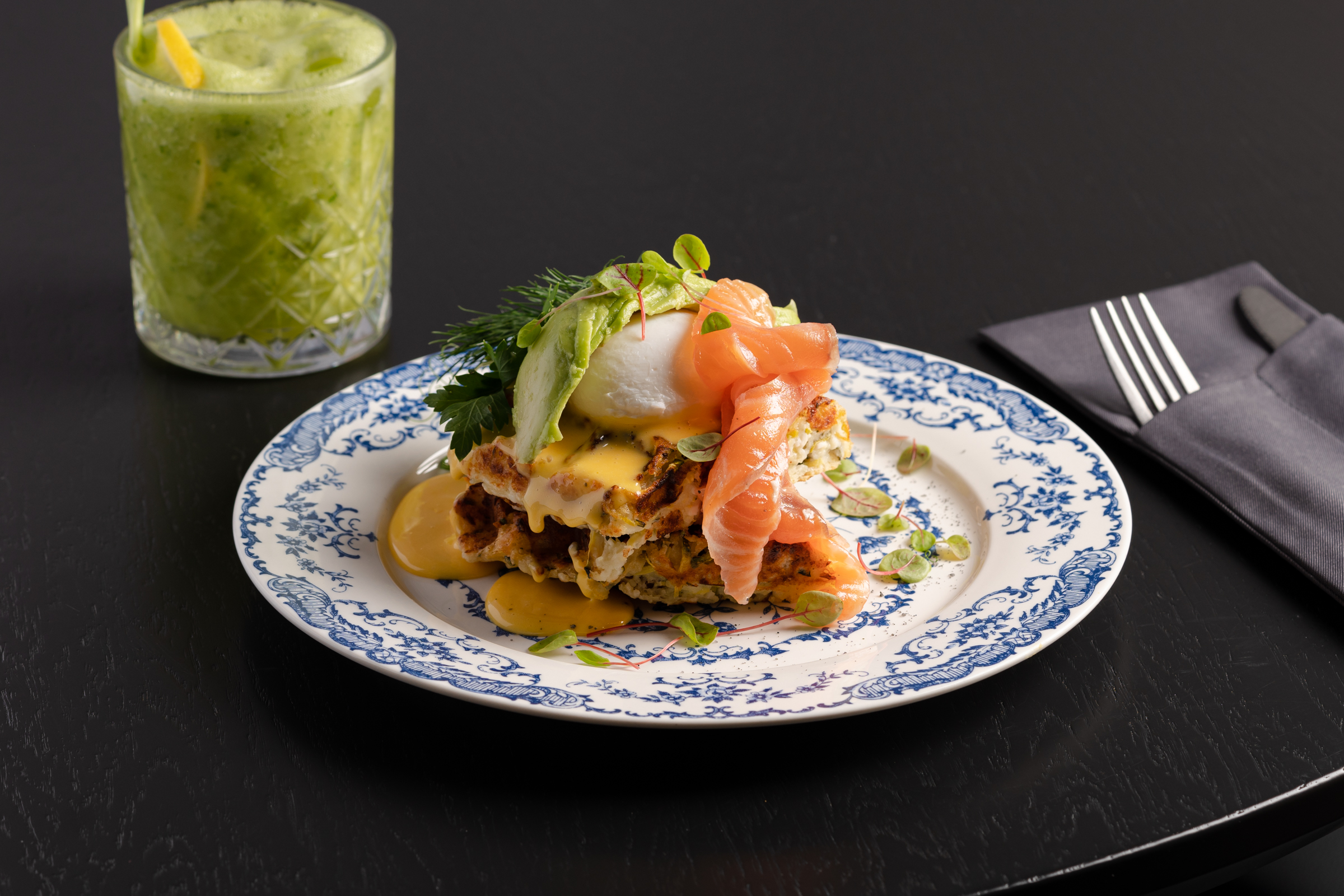 Вафля из цукини и творога с лососем и пашот