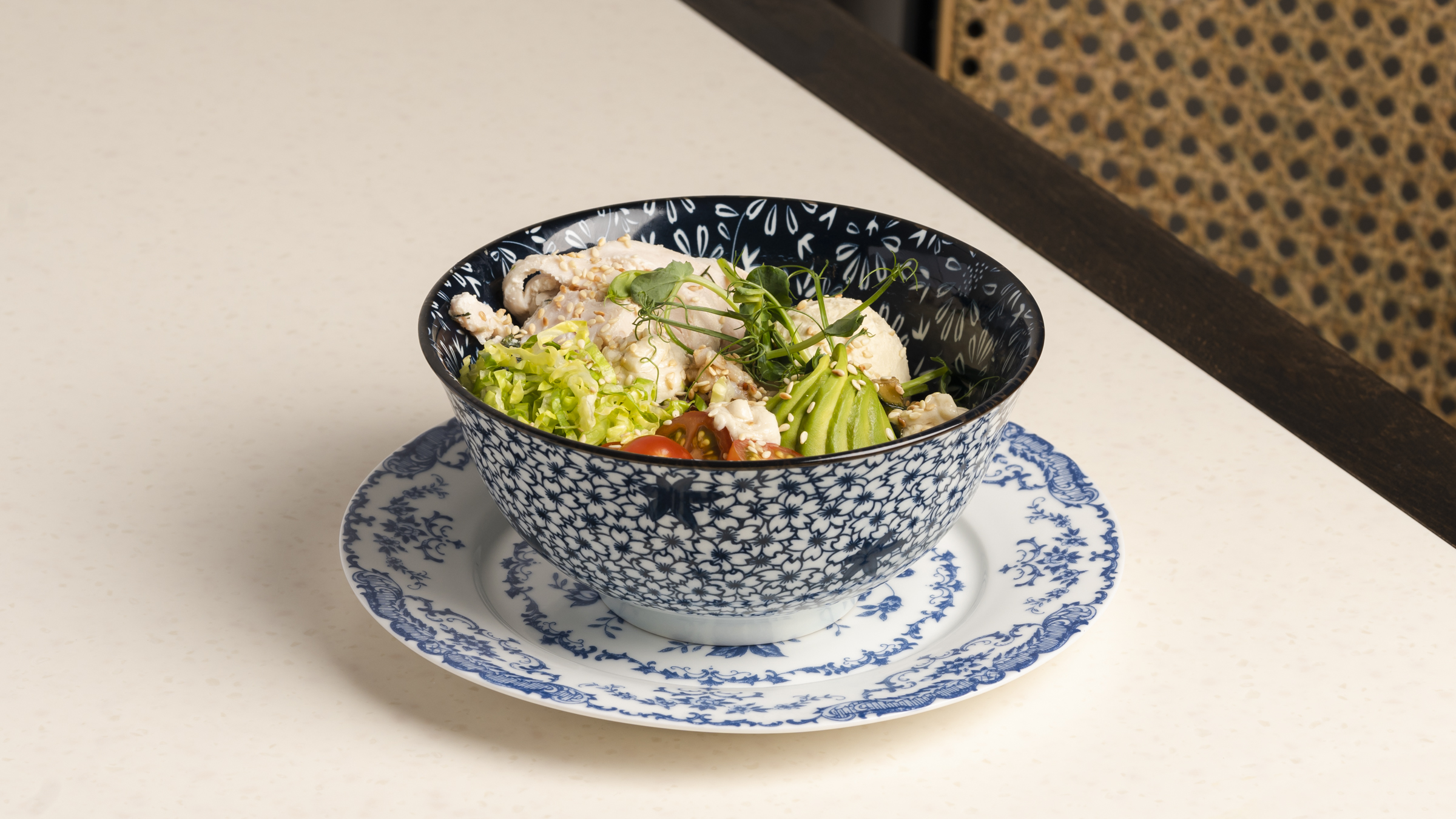 Питательный боул на основе смеси бурого и красного риса с нежным рулетом из индейки. Добавляем огурцы в соевом маринаде, авокадо, томаты черри, листья романо и микрозелень мангольда. В качестве заправки — хумус и соус тахина с каплей соевого соуса. Посыпаем кунжутом. Сытно, сбалансированно и с яркими акцентами.