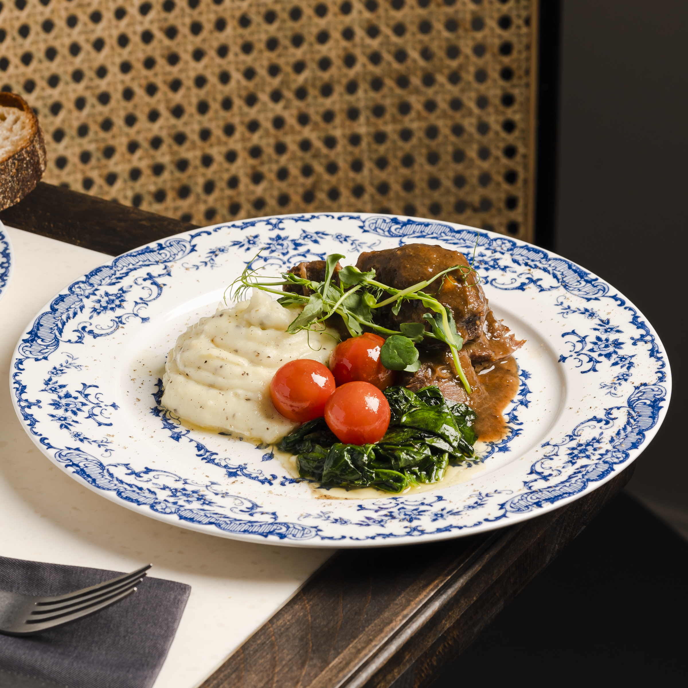 Нежные томлёные телячьи щёчки, приготовленные при низкой температуре до полной мягкости, подаются с бархатным картофельным пюре, обогащённым ароматом трюфеля. Это блюдо — о глубине вкуса, тепле и деликатной текстуре. Идеально для неспешного ужина и тех, кто ценит настоящее.